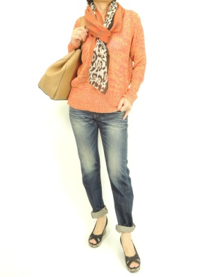 | ざっくりニットは綺麗な色を選ぶとカジュアルコーデも少しフェミニンに!フェミニン度50%、アクティブ度50%。 |