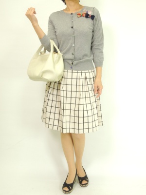 | リボンブローチやクルミボタンが可愛いカーデは一枚で着こなしてもお洒落。ふんわりスカートとの相性も抜群です!フェミニン度90%、エレガンス度10%。 |