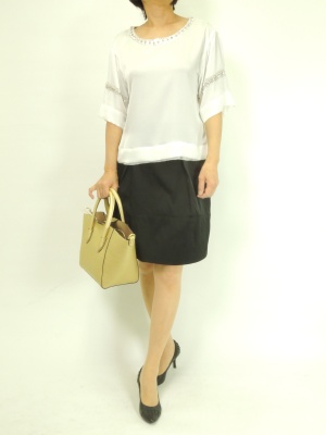 ビジューがきらめくシャイニーなブラウスはシンプルコーデが一番。コンパクトなスカートでスッキリと!エレガンス度70%、フェミニン度30%。