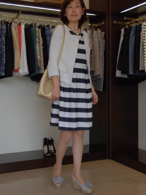 流行のボーダー柄もエレガントに装うなら白×黒のボーダーで・・・。白のJKで上品さをプラス!エレガンス度90%、フェミニン度10%。