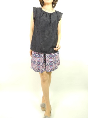 幾何学柄のキュロットはマルチなカラーなのでトップスを黒でしめるとスッキリお洒落に着こなせます!フェミニン度70%、スタイリッシュ度30%。