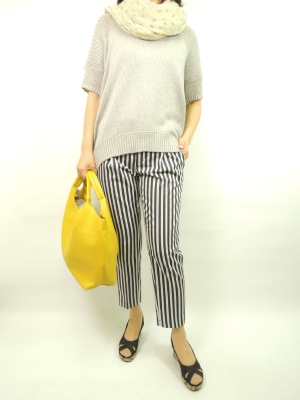 ストライプのパンツは一見インパクトがなさそうですが、ナチュラルトーンでまとめればスッキリまとまりますね!スタイリッシュ度90%、アクティブ度10%。