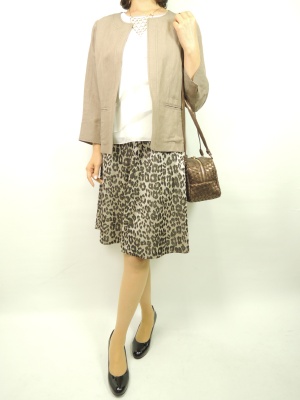 アニマル柄のスカートと麻のジャケット。同じトーンの色でグラデーションをつけると上品なコーデに仕上がります!エレガンス度70%、スタイリッシュ度30%。