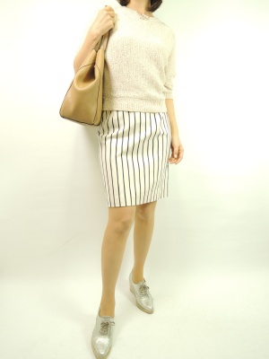 ストライプのスカートはベーシックにナチュラル系の色でまとめて大人のシンプルコーデを作ります!スタイリッシュ度90%、フェミニン度10%。