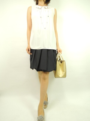 ふんわりバルーンスカートはトップスを上から重ねてコーディネート。衿元のビジューで華やかにお出かけファッション!エレガンス度90%、フェミニン度10%。