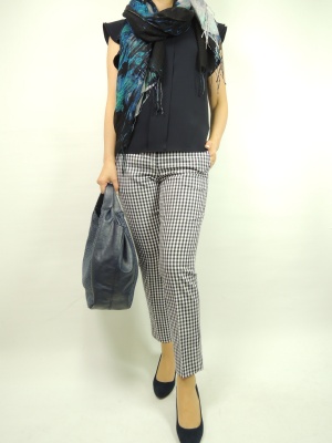チェックのパンツは今年流行ですね。シンプルにネイビーのブラウスで合わせてベーシックスタイルをご提案!スタイリッシュ度70%、エレガンス度30%。