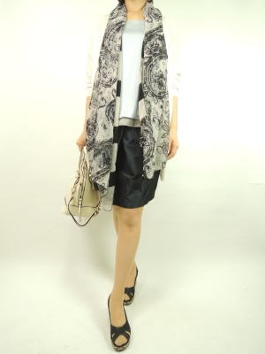 艶のあるインナーとスカートが縦のラインで結ばれてワンピースのように・・。着流しカーデに添ってストールを垂らしてエレガントに装ってみました!エレガンス度70%、フェミニン度30%。