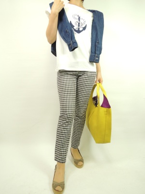 マリンのカットソーにギンガムチェックのパンツで大人のデイリーファッションを楽しんでみて!アクティブ度70%、フェミニン度30%。