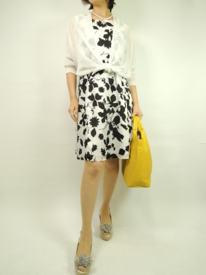 花柄の涼しげなワンピースは白×黒の大人のエレガンスな装いにピッタリ。羽織りも涼しげな白でまとめて!エレガンス度90%、フェミニン度10%。