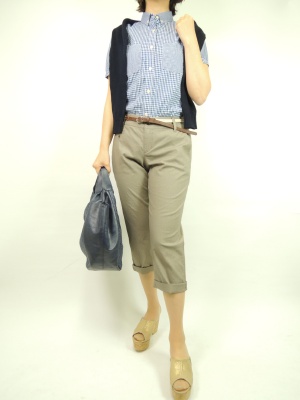 カーキ×ブルーはカジュアルの定番な色の組み合わせ。ギンガムチェックの二種使いがオシャレなシャツでGWを楽しんで!アクティブ度100%。