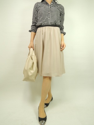 トラッドアイテムのシャツにフレアスカートを合わせてほんのり甘口ベースで着こなして!エレガンス度60%、フェミニン度40%。