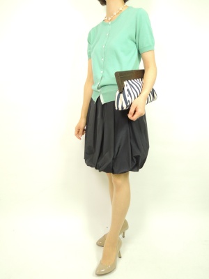 バルーンスカートはトップスをコンパクトにまとめるとスッキリ見えますね。グリーン×ネイビーで大人のコンサバスタイルに!エレガンス度60%、スタイリッシュ度40%。