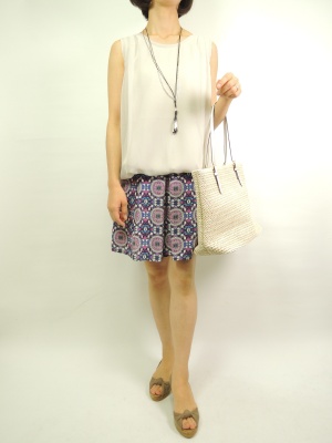 バッグスタイルにポイントがあるふんわりカットソーを主役にデジタルモザイクのショートパンツで軽やかに!フェミニン度70%、エレガンス度30%。