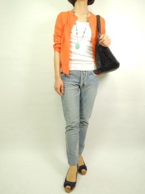 デニム風のスウェットはオレンジと合わせて綺麗目カジュアル!アクティブ度80%、スタイリッシュ度20%。