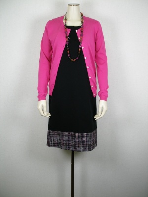 裾のツイードとカーデの色をリンクさせて。オフィスでもこんなハッキリしたピンクがかえって知的に映りますよ!スタイリッシュ度70%、フェミニン度30%。