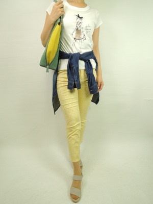 新鮮な生きろのギンガムチェックに可愛いカットソーを合わせたら深めのインディゴブルーのシャツで引き締めて!アクティブ度60%、フェミニン度40%。