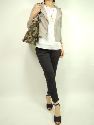 ドロストパンツも細みの綺麗目シルエットで上品に着こなしたい。夏には涼しい麻レーヨン素材で!スタイリッシュ度70%、エレガンス度30%。