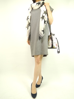 肌触りの良いシンプルなサックワンピにスター柄のストールを効かせてお洒落に!フェミニン度60%、スタイリッシュ度40%。