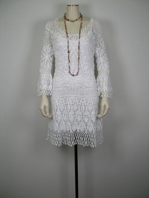 真っ白なカギ針ニットは重ね着せずシンプルに着こなして。ちらりとのぞく素肌がセクシーでいて、清楚でもあるワンピースです!フェミニン度80%、エレガンス度20%。