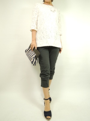 シアー素材を使ったエレガントなチュニックを細身のパンツで引き締めて!フェミニン度70%、スタイリッシュ度30%。