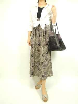 トレンドの南国柄のマキシ丈ワンピは涼しい素材の白シャツと合わせてリゾートにもタウンにも!エレガンス度50%、スタイリッシュ度50%。