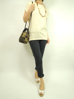 サラリと着られる黄色のボーダーカットソーと人気の定番パンツでデイリーファッションに!アクティブ度70%、スタイリッシュ度30%。