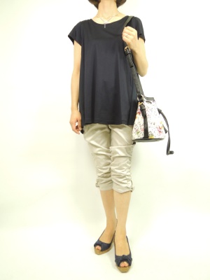 背中のリボンがとても可愛いカットソーはダークネイビーなので他のアイテムが甘くても良いバランスに!フェミニン度80%、スタイリッシュ度20%。