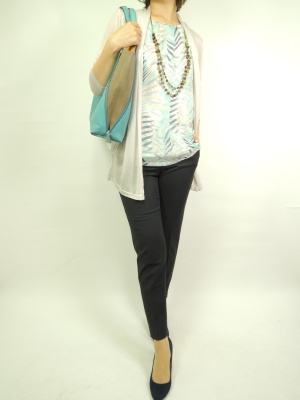 九分丈のパンツはさらっとした着ながしカーデでスレンダーに着こなすのが一番!スタイリッシュ度90%、エレガンス度10%。
