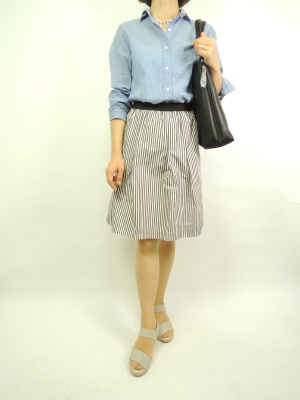 ふんわりとした黒のストライプのスカートはお腹もカバーしながら軽やかでオシャレ感UP。アクセは今年顔ので決まり!スタイリッシュ度70%、アクティブ度30%。