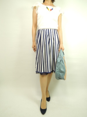 チュールを重ねたスカートは取り外し可能アイテム。爽やかストライプにふりふりカットソーでキュートな夏に!フェミニン度70%、スタイリッシュ度30%。