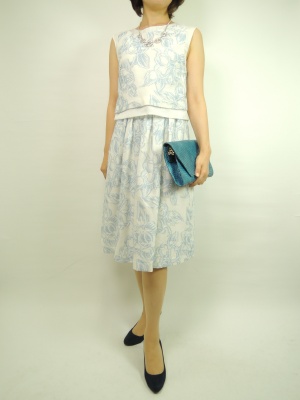 アンサンブルは今年注目ですね。涼しげな白地にブルーの刺繍柄。やや長めのスカート丈がとても新鮮ですね!スタイリッシュ度90%、エレガンス度10%。