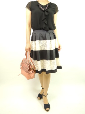 フラワーモチーフのレース使いが夏の黒の装いを涼しげかる大人可愛く見せます。透明感のあるビジューアクセを合わせて華やかに!フェミニン度70%、エレガンス度30%。