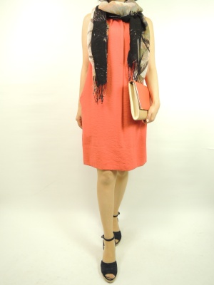 暑くなる季節に重宝しそうな着心地の良いワンピースは日差しに映えるオレンジカラーで。ボタンカル柄のストールで大人っぽく!エレガンス度60%、スタイリッシュ度40%。