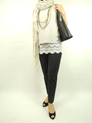 ニットとレースのコンビ使いが素敵なトップスは、ストールをネックレスの重ねつけで、美しい寒色カラーのグラデーションコーデに!