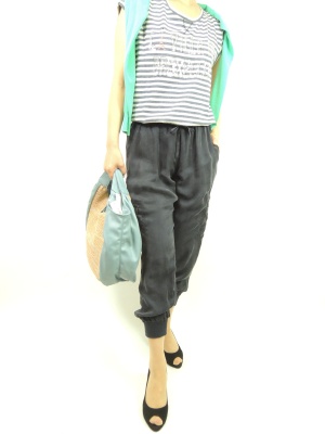 麻混紡のロゴ入りボーダーTシャツとドロストパンツはラクかわな組み合わせ。カラーのカーデでアクセントをつけるのがポイント!アクティブ度80%、スタイリッシュ度20%。