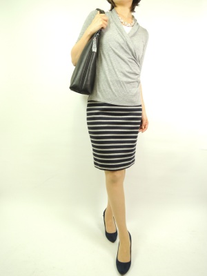 カシュクールタイプのカットソーはボーダースカートと組み合わせてスタイリッシュなコーデに仕上げました!スタイリッシュ度70%、エレガンス度30%。