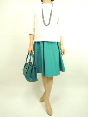 スエットの可愛いプルオーバーと光沢がかったスカートで初秋のエレガントコーデに!エレガンス度60%、フェミニン度40%。