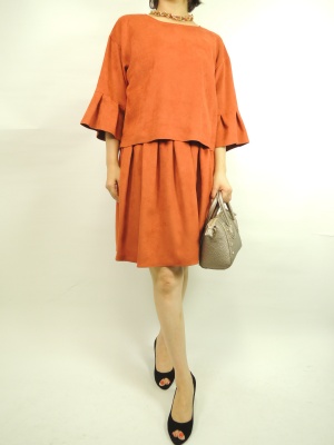 お袖が可愛らしいセットアップは流行色のオレンジで秋らしい華やかさになります。同系色のチェーンネックレスで綺麗なワントーンコーディネーションに!エレガンス度60%、フェミニン度40%。