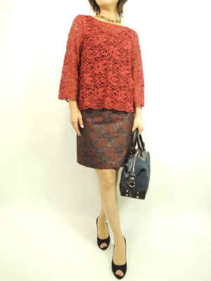 ボルドー色は秋一番に取り入れたい新色ですね。レースの透け感がオシャレ度をアップさせてくれます!エレガンス度80%、フェミニン度20%。