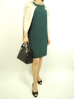 濃い目のグリーンも秋の新色です。ベーシックなデザインにはカーデで色を添えて!スタイリッシュ度70%、エレガンス度30%。