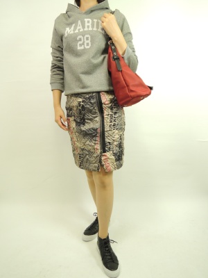 英字新聞をプリントしたボンディング生地のスカートはカジュアルコーデにピッタリ!アクティブ度90%、フェミニン度10%。
