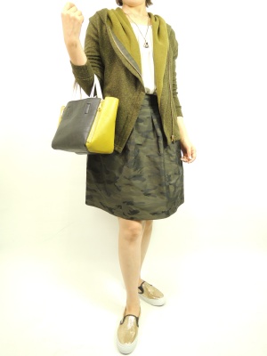 迷彩スカートと同色のカーキをパーカにリンク。ブラウスで明るさをプラスしてフェミニンスタイルに仕上げました!フェミニン度70%、アクティブ度30%。