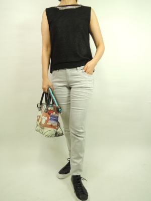 ノースリーブのお洒落ビジュー付きカットソーをデニムで外してカジュアルにまとめる!アクティブ度60%、エレガンス度40%。