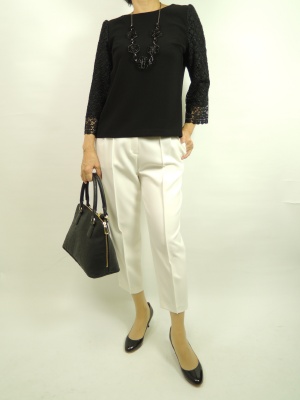 白×黒。モノトーンの組み合わせは地味の様でしっかり主張したコーディネート。裾のレースがエレガントな装いにピッタリです!エレガンス度80%、スタイリッシュ度20%。
