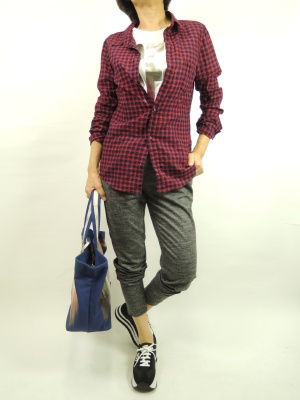 ゆるシルエットの代表スウェットパンツはデイリーには欠かせない。シャツスタイルでさらにオフを楽しんで!アクティブ度70%、スタイリッシュ度30%。