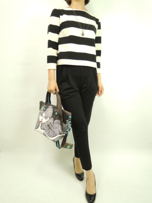 スッキリした美シルエットのテーパードパンツは伸縮性もあって動きやすい。ボックスシルエットの黒白ボーダーで合わせてもエレガントに決まります!エレガンス度70%、アクティブ度30%。