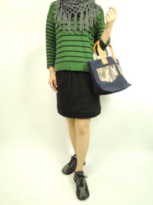 グリーンベースのボーダーニットはカジュアルスタイルにピッタリ。起毛素材のミニスカートでアクティブながらも落ち着いた雰囲気に!アクティブ度70%、フェミニン度30%。