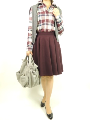 秋の気分を盛り上げるボルドーのコーディネート。活用度大のチェックのネルシャツにサーキュラースカート、肩にかけたカーデもオシャレですよ!フェミニン度80%、エレガンス度20%。