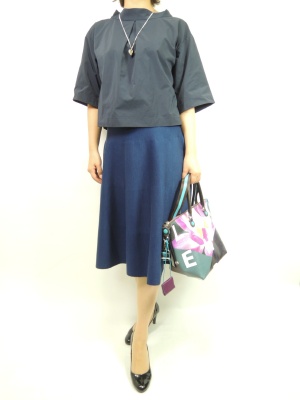 VERY掲載(P477)の厚手のニットのミモレ丈スカートは、少しショート丈の可愛いデザインのネイビーのブラウスを合わせて最旬のコーディネートにしました!フェミニン度70%、スタイリッシュ度30%。