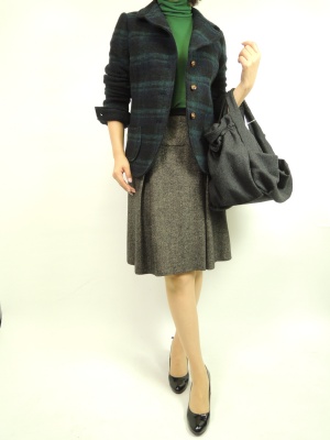 チェック柄のジャケットにツイードのボックススカートを合わせる。新色のグリーンを投入するだけで秋のトラッドコーデの完成!フェミニン度60%、スタイリッシュ度40%。